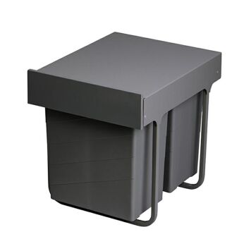 Wysuwne pojemniki na odpady BRENO do szafek kuchennych. Prowadnice umożliwiają łatwe wysuwanie i wsuwanie pojemników. Materiał: stal hartowana, tworzywo sztuczne Kolor: antracyt (malowany proszkowo) Szerokość szafki: min. 330mm Mocowanie: za pomocą wkrętów, do podstawy szafki W zestawie: -stelaż z prowadnicami z funkcją zatrzasku, który zapobiega samoczynnemu wysuwaniu się sortownika -2x pojemnik o pojemności 14L z uchwytem -2x przegroda do pojemników 14L umożliwiająca podział kosza na dwa mniejsze -2x pokrywka do pojemników 14L Głębokość: 411mm Szerokość: 330mm Wysokość: 383mm